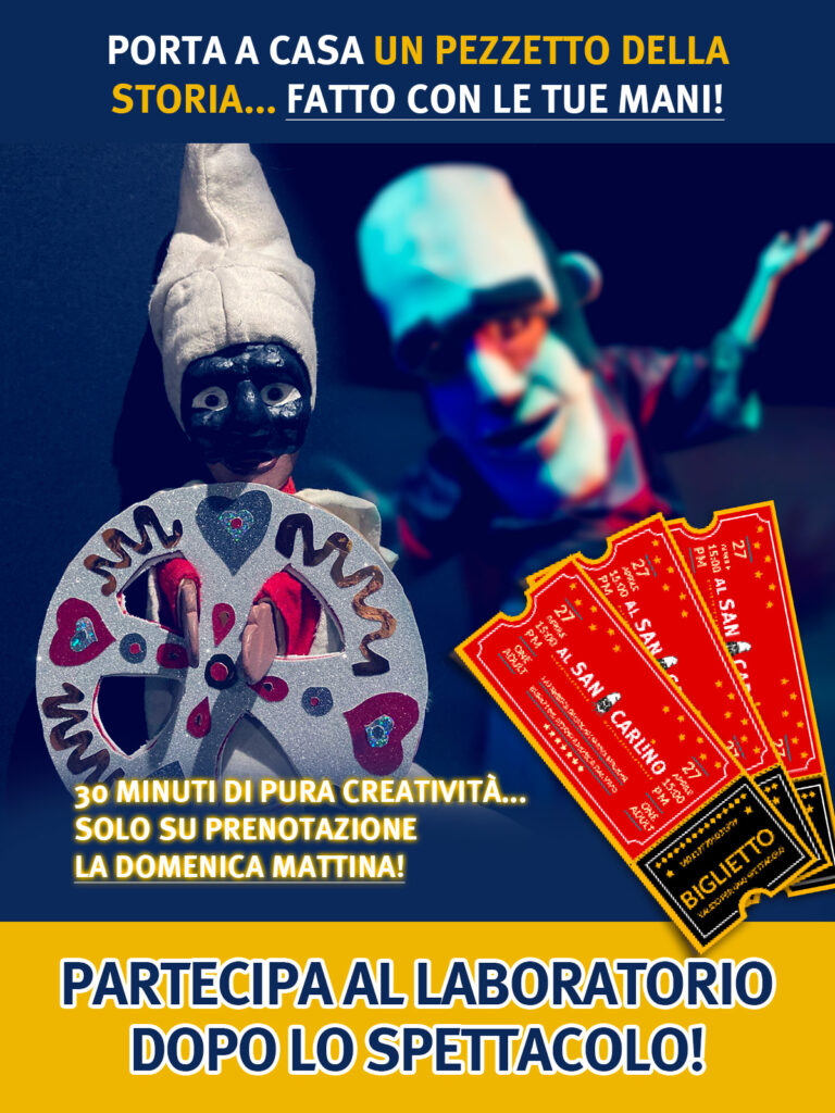 Per i soli spettacoli della domenica mattina (15, 22 e 29 marzo) è disponibile anche lo speciale Laboratorio. Acquista il biglietto extra che trovi disponibile qui sul sito